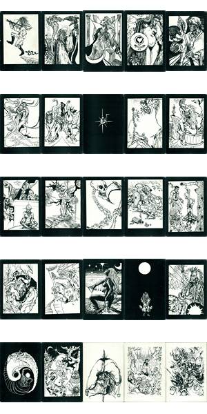 Bohemian Tarot (Majors) by Geoff Day. Australia, Self-Published, 1990. 27 cards. Majors 200x140mm. Limited edition, no 22 of 100. This was the first version of the Book of Kaos deck. The artist Geoff Day later took on the persona of a prolific visual, sonic and textual artist-magickian, organising performances in many countries of magical rituals under the name Orryelle Defenestrate-Bascule. This first deck included five extra cards - Blood and The Grove, with a suit of three Drug cards, Drunk, Stoned and The Trip. His imagery is always witty and informed. Supplied in a card wallet with an explanatory leaflet. Apparently the Minors were also issued in this format in 1990. Perfect condition. 0.1Kg. Very rare.