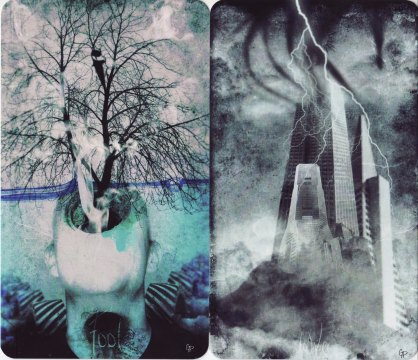 Pantoulas Tarrot by George Pantoulos, Self-published. 2012. This tarot was the basis for an exhibition of digital collaged photographs during July 2012 in the Tailor Made Cafe in Athens. Following the exhibition the artist had these printed as a set of cards. His imagery is powerful, often visceral and it is skilfully realised, with some focus on bird forms. The deck is subtitled "A surrealistic view within the human soul". 22 large cards 200x115mm. Limited edition of 10. this is number 3, signed by George Pantoulos.