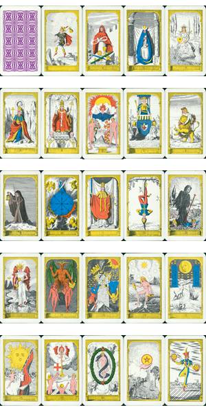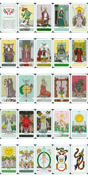 Enoil Gavat Tarot by Giorgio Tavaglione, 1983. 'Enoil Gavat' is, of course, 'Tavaglione' written backwards. Each card has an array of correspondences set in the ornate frame around each image. 78 cards 160x81mm.