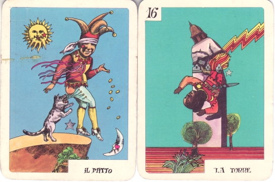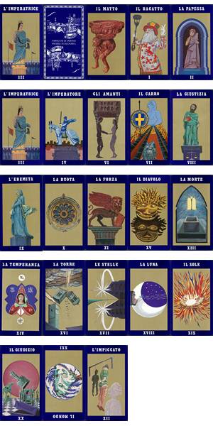 Tarocchi perduti di S. Sindici by S. Sindici, Andrea Forte, Alia Uno, Rome. 1988. 35 cards Majors only deck. 100x70mm.