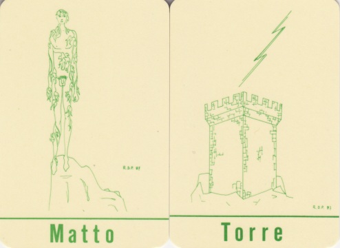 55 Tarocchi di Alan by Ivana Garibaldi and Ermindo Gabbrielli, Mauro Boldi (Alan), Giuseppe Bonazzoli. Modiano. 1983. 22 Major Arcana all renamed, but recognisably tarot. Minors have swords, batons, cups with eight cards, and coins with nine. The Milanese astrologer Mauro Boldi here distilled the elements of Tarot into a smaller set of cards, possibly to allow use in card games. The cards are double ended as with playing cards and Jeu de Tarot. 55 cards 107x63mm.