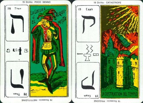 Tarocco Egiziano Bietta Italy. 1983. Colored Italian version of the Tarot Egipcios, attributed to Dr Moorne, this deck features Etteilla keywords top and bottom (reversed), divinatory art to the right, the left panel contains the corresponding Hebrew letter (Continental school attributions) on majors and corresponding Tarot and playing cards on the minors. 78 cards 120x83mm.