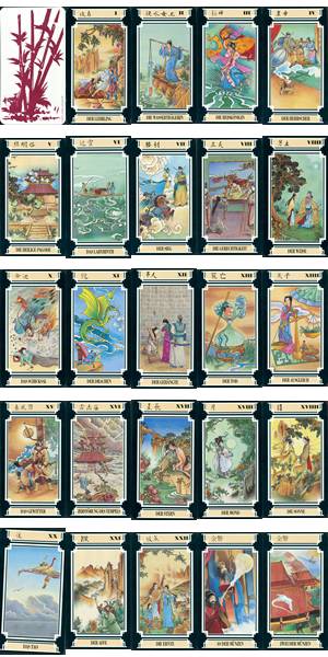 Goldenen Drachen Tarot by Marie Delclos, Jean-Louis Victor. AG Mueller, 1994. The Majors of the Japanese style Golden Dragon Tarot are renamed, and translate from the German: 1 The Apprentice, 2 The Water Carrier, 3 The Queen of Rice, 4 The Emperor, 5 The Sacred Pagoda, 6 The Labryinth, 7 Victory, 8 Justice, 9 The Master of Wisdom, 10 Destiny, 11 The Dragon, 12 The Hanged Man, 13 Death, 14 Balance, 15 The Thunderstorm, 16 Destruction of The Temple, 17 The Star, 18 The Moon, 19 The Sun, 20 The Tao, 21 The Monkey, 22 The Harvest. 78 cards 135x75mm.