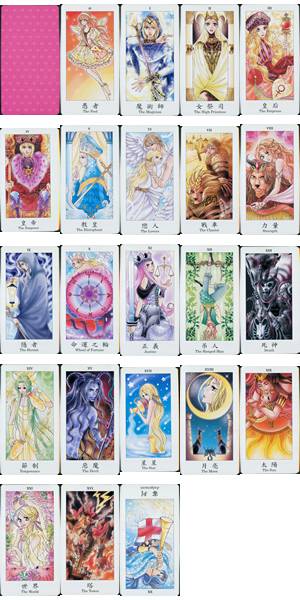 Kawai Love Tarot Softtek, 2004. Created digitally. 22 cards Majors only 121x71mm. Boxed Tarot with book. Long out of print, and difficult to find.