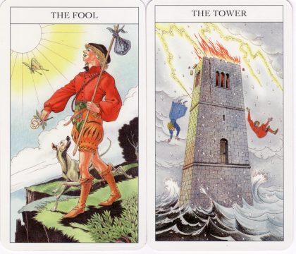 Tarot of Portmeirion (Majors) by Craig Conley, 2002. Based on photographs, by Michael Warwick, of Portmeirion village in Gwynedd, North Wales, which was designed and built by Sir Clough Williams-Ellis between 1925 and 1975 in the style of an Italian village. This was used as the location for 'The Prisoner, television series, 1967. Supplied with a 58 page book with illustrations of the full 78 cards. 26 cards 85x65mm. Majors plus four cards for the suits
