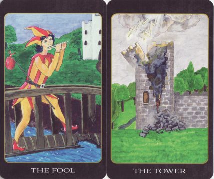Three Rabbits Tarot by Paul Antcliffe, Self-published, 2006. Created in a low res computer drawing program. Published in a number of different versions. With paperback book. 78 cards 71x50mm.