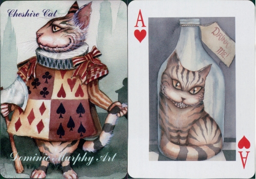 Alice in Wonderland Playing Cards by Dominic Murphy 2012. Set of playing cards, not tarot. Two Jokers. Dominic Murphy is a UK based artist with great inventiveness and skill at drawing. His artwork is often dark and yet full of humour. He is very prolific and has produced a few decks of cards, some on one of his favourite themes of Lewis Carroll's Alice. 54 cards 90x63mm.
