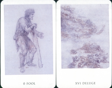 Da Vinci Enigma Tarot by Leonardo da Vinci, Caitlin Matthews, Connections, 2005. Drawings from Leonardo da Vinci's notebooks. Reproduced drawings of Da Vinci. Backs of cards form a pattern. 78 cards 118x80mm.